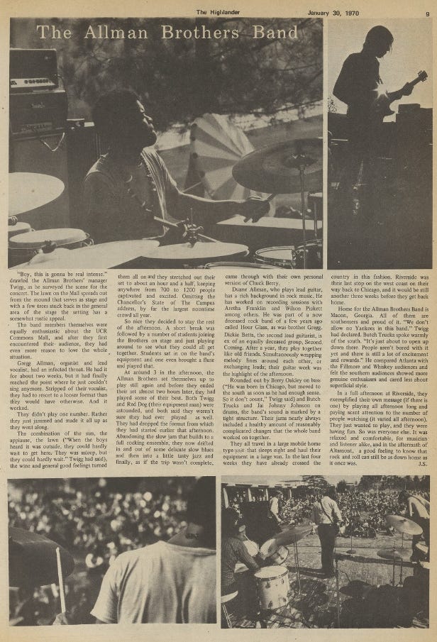 Pretty excited to share this essay/review by legendary rock writer Joel Selvin1 of the Allman Brothers’ January 26, 1970 appearance at University of California-Riverside.