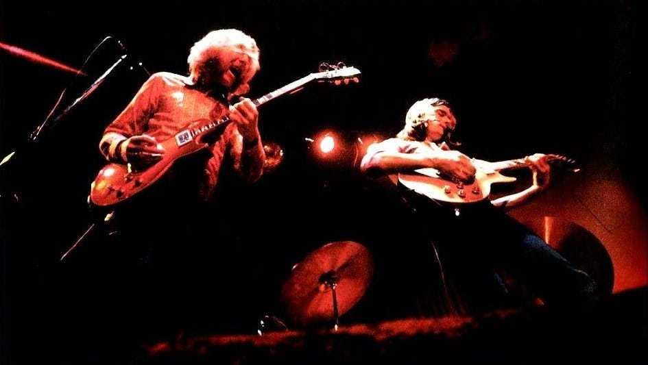 Berry’s marching toward Dickey, who’s leaning back “hittin’ the note.” Duane is leaning in, concentrating.